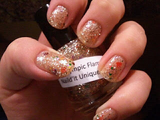 So, today I have Naild'It Unique Polish in Olympic Flame. This polish has a clear base with small silver hex glitter, copper hex glitter that is a little bit bigger than the silver, pink hex glitter that is a little bigger than the copper, yellow, purple, and green hex glitter that is slightly larger than the pink, medium/large red hex glitter, silver star glitter, and red heart glitter. This is all jammed into one bottle, amazing! This is one awesome sparkly glitter bomb that I love! The application was great there were tons of different colors and sizes with each brush dip. No problems with bald spots. Dry time was excellent. I didn't have to "fish" around for the hearts or stars. I just put the lid on and gave it a shake and I got them that way. So without further ado here is the wonderful must have: